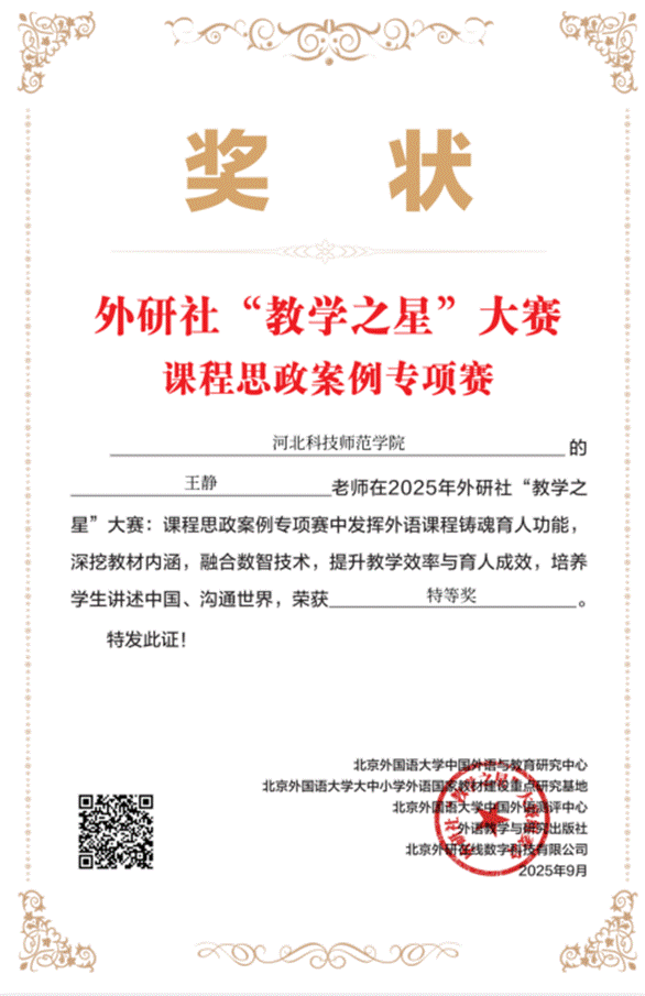 日前,2025年外研社“教学之星”大赛:课程思政案例专项赛评选结果揭晓,我校外国语学院教师王静凭借彰显独特教学智慧的创新设计,在全国各高校教师同台竞技的激烈角逐中荣膺全国特等奖,这是河北省唯一获得特等奖的教师,为学校赢得了荣誉。