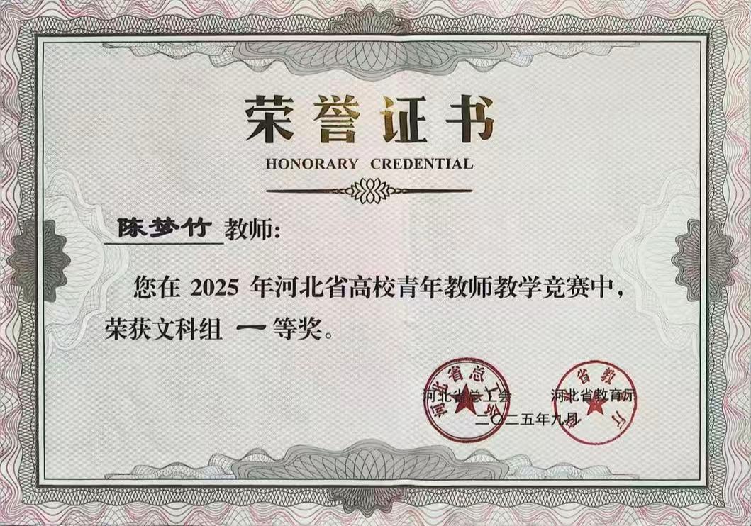 2025年9月28日至30日,由河北省总工会、河北省教育厅联合主办的河北省高校青年教师教学竞赛,在石家庄职业技术学院圆满落幕。本次竞赛汇聚全省各高校139名优秀青年教师同台竞技,经过激烈比拼,我校财经学院陈梦竹老师凭借扎实的教学功底与出色的现场表现,成功斩获文科组一等奖。