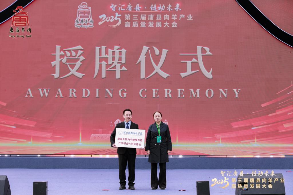 会上,集中展示了我校、内蒙古农业大学等单位与唐县达成的战略合作成果,为“河北科技师范学院唐县舍饲肉羊健康养殖产学研合作示范基地”进行了授牌,该基地将整合高校科研人才优势与唐县产业政策资源,引领肉羊产业走上健康、高效、绿色的可持续发展道路。同时,大会为唐县畜牧业协会、唐县肉羊服务中心揭牌,中国(唐县)肉羊产业数字化服务平台发布。