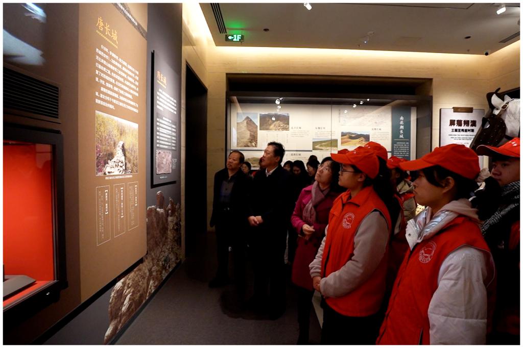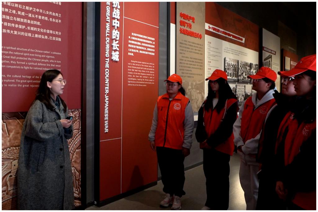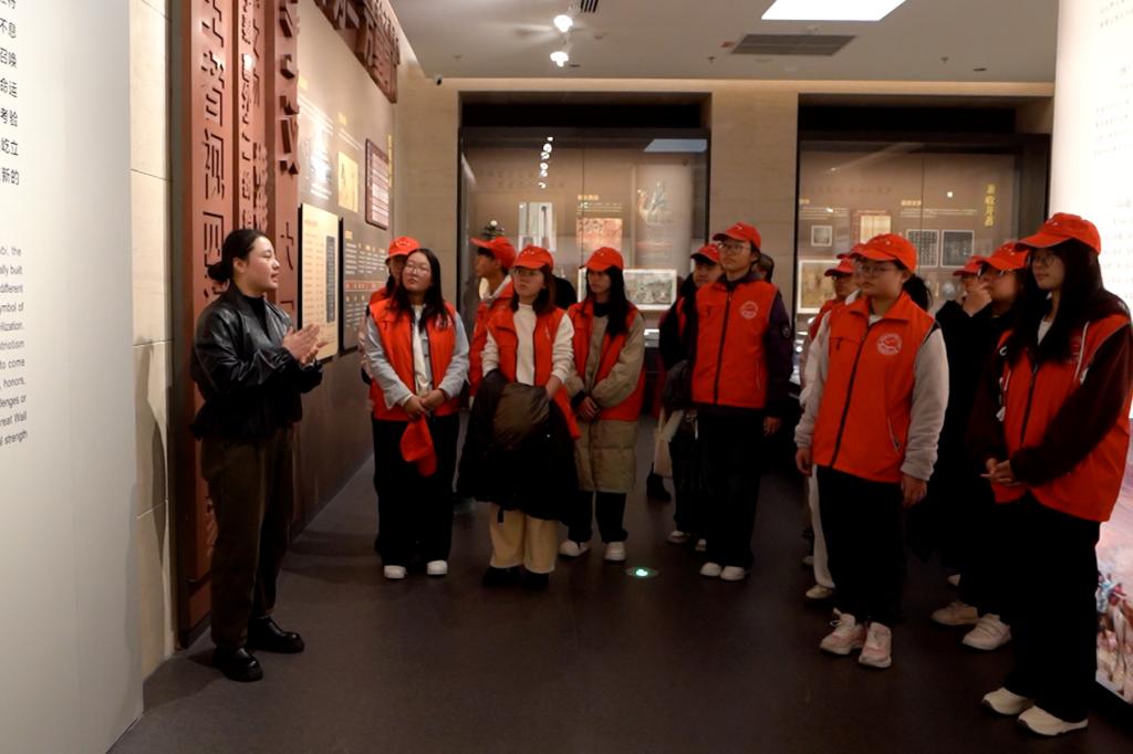 授旗仪式后,在博物馆专业讲解员引领下,师生们依次走进“长城历史沿革”“军事防御体系”“民族文化交融”等主题展区。从战国时期诸侯争霸的夯土残垣复原模型,到明代“戚家军”戍守边关的兵器实物;从记录戍边将士家书的竹简拓片,到展现各民族互市贸易的文物展陈……一件件承载岁月印记的展品,串联起长城两千余年的兴衰脉络。“原来长城不仅是防御工事,更是各民族共同守护家园的文化纽带!”学生预备党员李悦在观看“茶马古道与长城商贸”展区时感慨。通过实地探访,师生对长城“团结统一、坚韧不屈、开放包容”的精神内核有了更具象的认知。