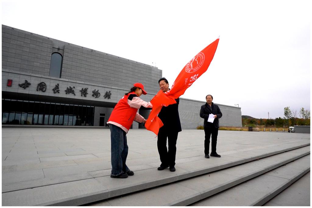 下午2时许,活动在庄严的授旗仪式中拉开帷幕。仪式由马克思主义学院党委书记郭立昌主持。校党委副书记王松手持印有“探寻长城文化 厚植家国情怀”字样的鲜红旗帜,郑重授予“思政先锋学习团”。旗帜飘扬,征程再启,既是对青年学子的殷切嘱托,更标志着本次“行走的思政课”正式开启跨越时空、触及灵魂的精神传承之旅。“长城是中华民族的精神脊梁,希望同学们以脚步丈量历史,感受民族的坚韧与智慧,感悟家国天下的情怀,把长城精神刻进青春底色,将这份厚重的文化自信与爱国情怀化为砥砺前行的不竭动力。”王松在授旗后寄语师生。