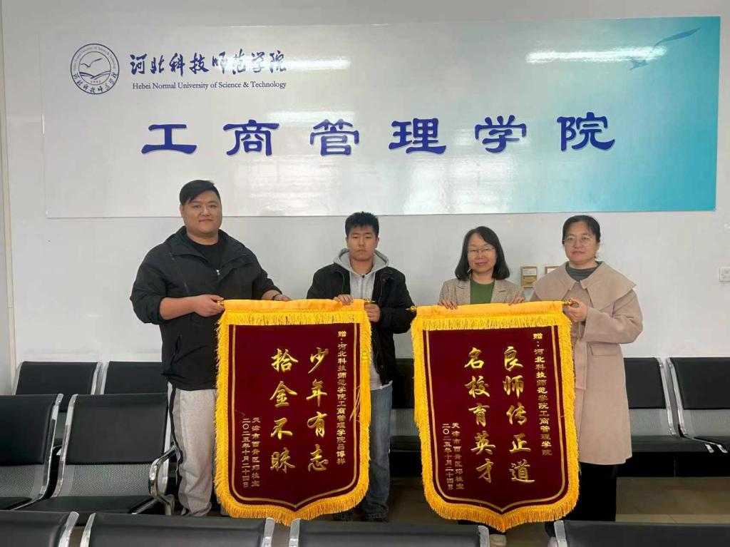 2025年10月24日下午,天津市西青区的邓先生手捧锦旗,满怀喜悦地来到河北科技师范学院工商管理学院学生工作办公室,将印有“少年有志,拾金不昧”和“良师传正道,名校育英才”的两面锦旗亲手交到学院老师手中。