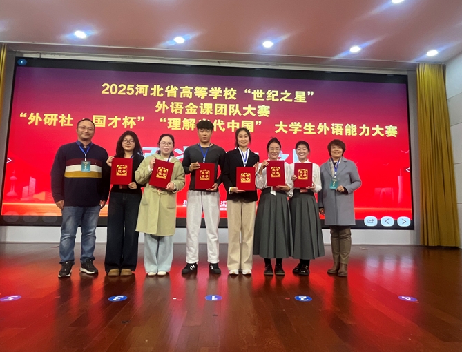 2025年11月,河北省高等学校“世纪之星”“外研社·国才杯”“理解当代中国”大学生外语能力大赛按照赛项分期举行。这场覆盖全省近70所高校、汇聚外语精英的巅峰对决,以其高规格、高强度的竞技水准成为检验高校外语教学实力与学子综合素养的核心舞台。在强手如林的赛场上,我校参赛学子沉着应战、从容不迫,以过硬的专业功底、默契的团队协作与卓越的临场应变,在语言表达、思辨交锋与跨文化沟通的多重考验中脱颖而出。他们用精准流畅的语言表达、深刻独到的见解思考、自信昂扬的精神风貌,既展现了高效解决复杂问题的综合能力,彰显了我校学子厚积薄发的学术素养与坚韧不拔的心理素质,赢得了现场评委的高度赞誉与对手的由衷敬佩。