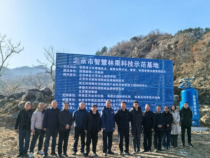 2025年11月28日,北京市园林绿化局产业发展处三级调研员张俊民、产业发展中心林果花卉科科长陈浩一行,到我校板栗产业技术教育部工程研究中心(以下简称“板栗中心”)位于北京市怀柔区琉璃庙镇西台子村的智慧板栗科技示范基地,开展实地考察与工作指导、座谈交流。怀柔区园林绿化局副局长刘超杰、板栗站站长刘振丽,怀柔区农业农村局政策调研与产业发展科王熙浓,琉璃庙镇副镇长张金亚、林业站站长唐云飞,西台子村书记高海龙,河北省林业和草原局政策法规处副处长刘辉,我校板栗研究中心主任张京政,河北八德农业科技有限公司董事长赵锁生,国家林业和草原局林草乡土专家陈国正等陪同考察。