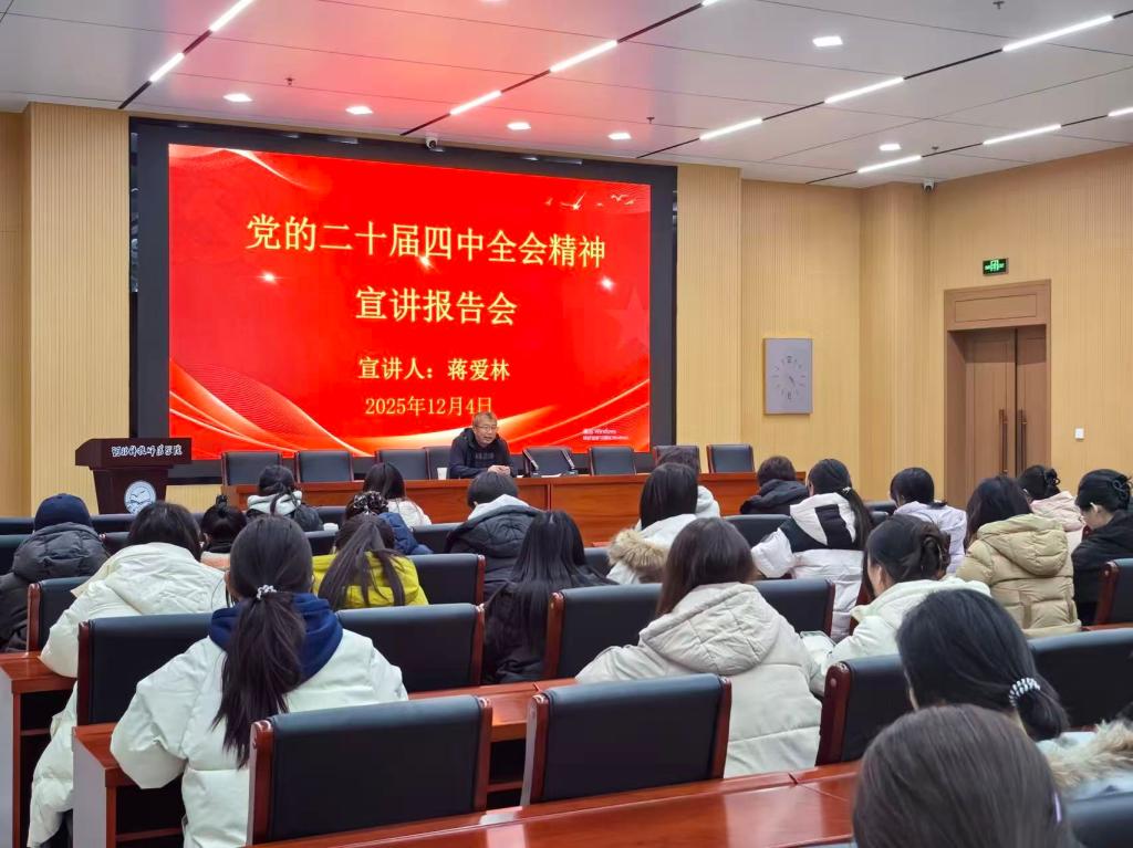 12月4日,党委副书记蒋爱林为外国语学院学生党员及入党积极分子作了党的二十届四中全会精神宣讲。宣讲紧扣全会核心要义,既阐释政策理论内涵,又结合高校育人实际与外语专业发展方向,为师生锚定个人成长与国家发展的结合点。