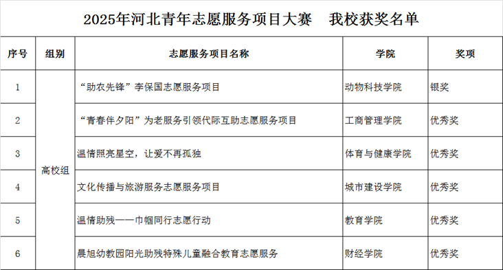 近日,由团省委、省委社会工作部、省教育厅、省水利厅、省文化和旅游厅、省卫生健康委、省残联联合主办的2025年河北省青年志愿服务项目大赛中,我校荣获银奖1项、优秀奖5项。