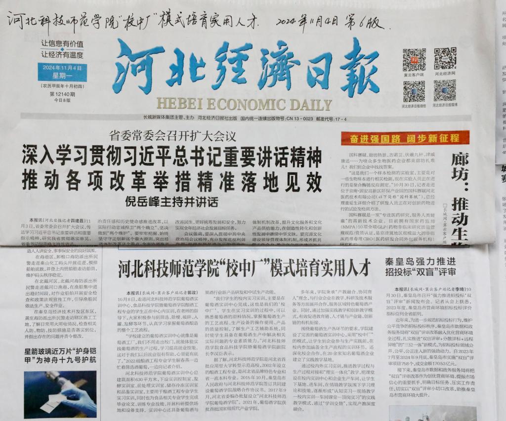 2024年11月4日,《河北经济日报》以河北科技师范学院“校中厂”模式培育实用人才为题,对我校食品科技学院暨葡萄酒学院葡萄酒实训中心酿酒工程专业学生实训情况进行了详细宣传报道。