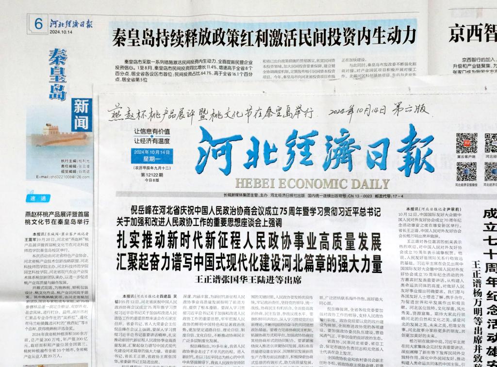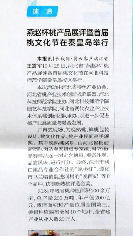 2024年10月14日,《河北经济日报》2024年10月14日第六版,以燕赵杯桃产品展评暨桃文化节在秦皇岛举行为题,对河北省“燕赵杯”桃产品展评暨首届桃文化节在河北科技师范学院隆重举行情况进行了详实报道。
