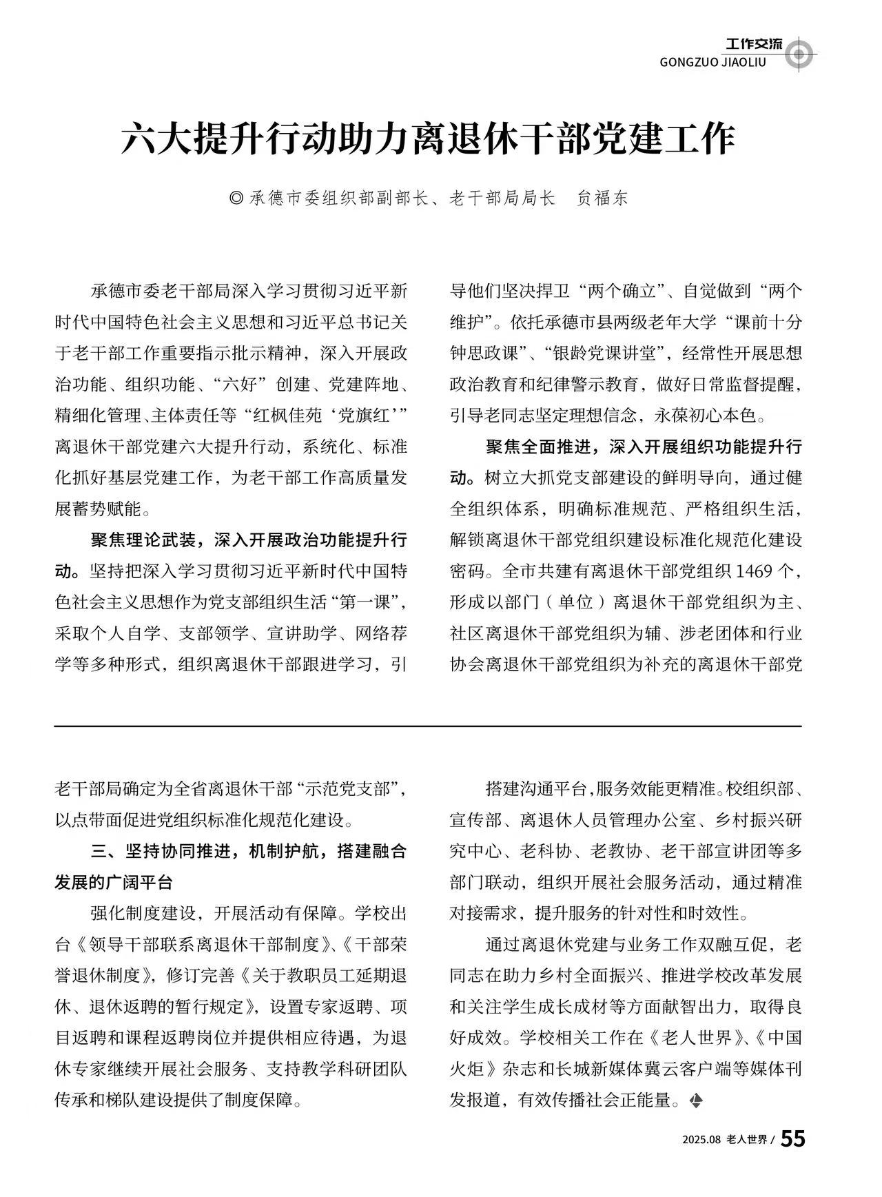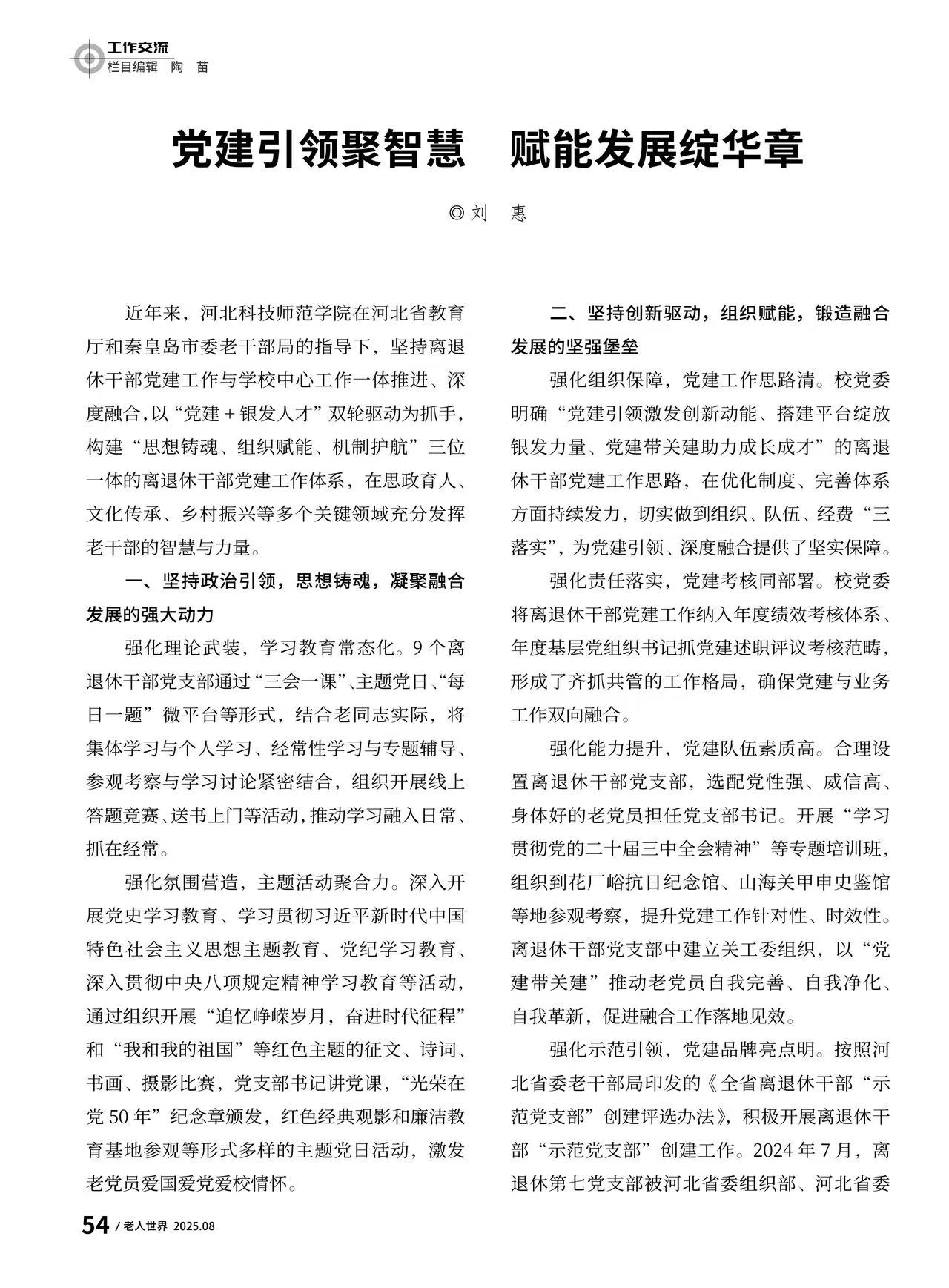 近日,由中共河北省委老干部局主管的《老人世界》杂志2025年第八期“工作交流”栏目,刊发了我校离退办刘惠撰写的《党建引领聚智慧赋能发展绽华章》一文,集中展现了我校离退休干部党建工作的特色成果与实践经验。