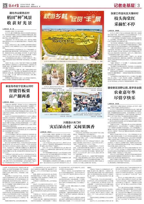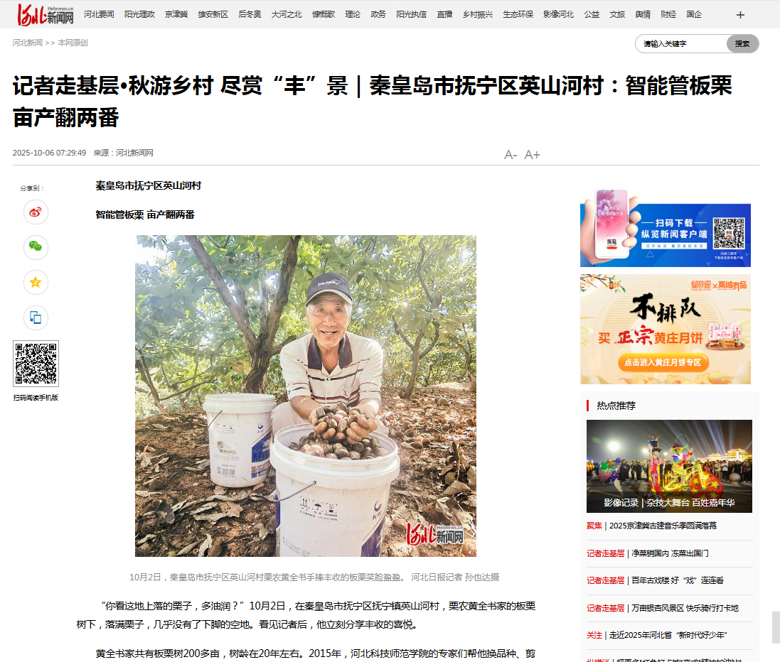 2025年10月6日,《河北日报》第三版,记者走基层,以“智能管板栗,亩产翻两番”为题,对我校板栗研究中心张京政教授科研团队与河北八德农业科技有限公司共同研发的“板栗智能水肥控制系统”,在秦皇岛市抚宁区英山河村栗农黄全书拿出的50亩板栗树做为实验地进行实验,当年亩产就增加到300多公斤的丰产情况进行了宣传报道。河北新联网等媒体进行了同步报道。