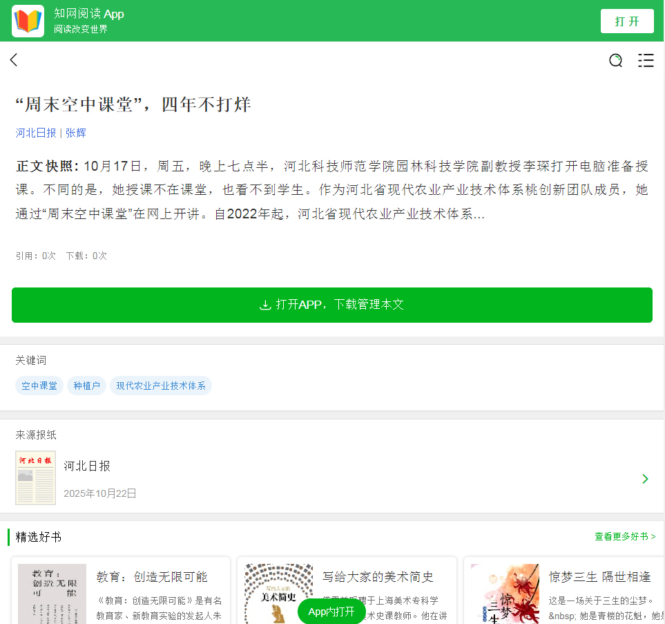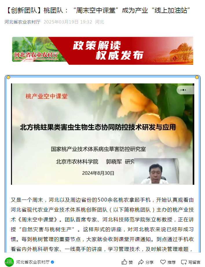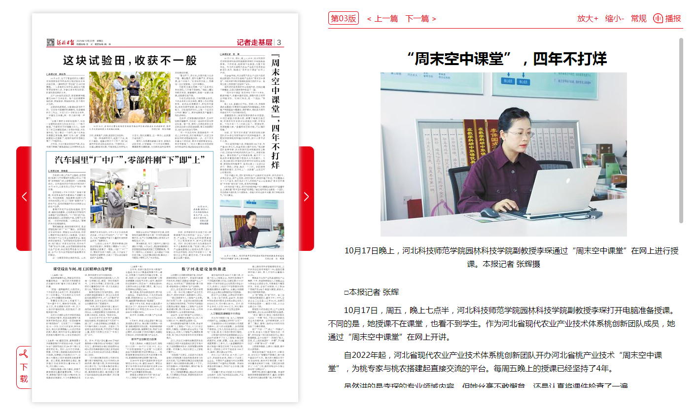 2025年10月22日第三版,记者走基层,以“周末空中课堂,四年不打烊”为题,对我校河北省现代农业产业技术体系桃创新团队首席专家张立彬教授带领的河北省现代农业产业技术体系桃创新团队开办河北省桃产业技术“周末空中课堂”,为桃专家与桃农搭建起直接交流的平台,每周五晚上的授课已经坚持了4年情况进行了宣传报道。《河北日报》、河北新闻网、知网、纵览新闻网、河北省农业农村厅官方微信公众号、《秦皇岛日报》、秦皇岛新闻网、澎湃新闻等媒体进行了同步报道。