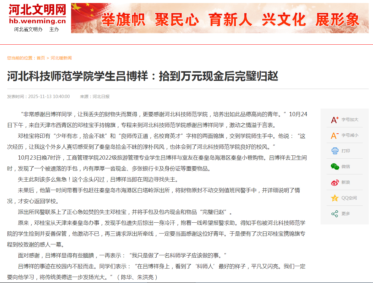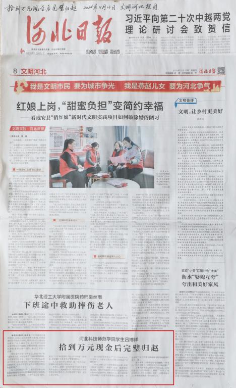 11.132025《河北日报》:河北科技师范学院学生吕博祥 拾到万元现金后完璧归赵【党委宣传...