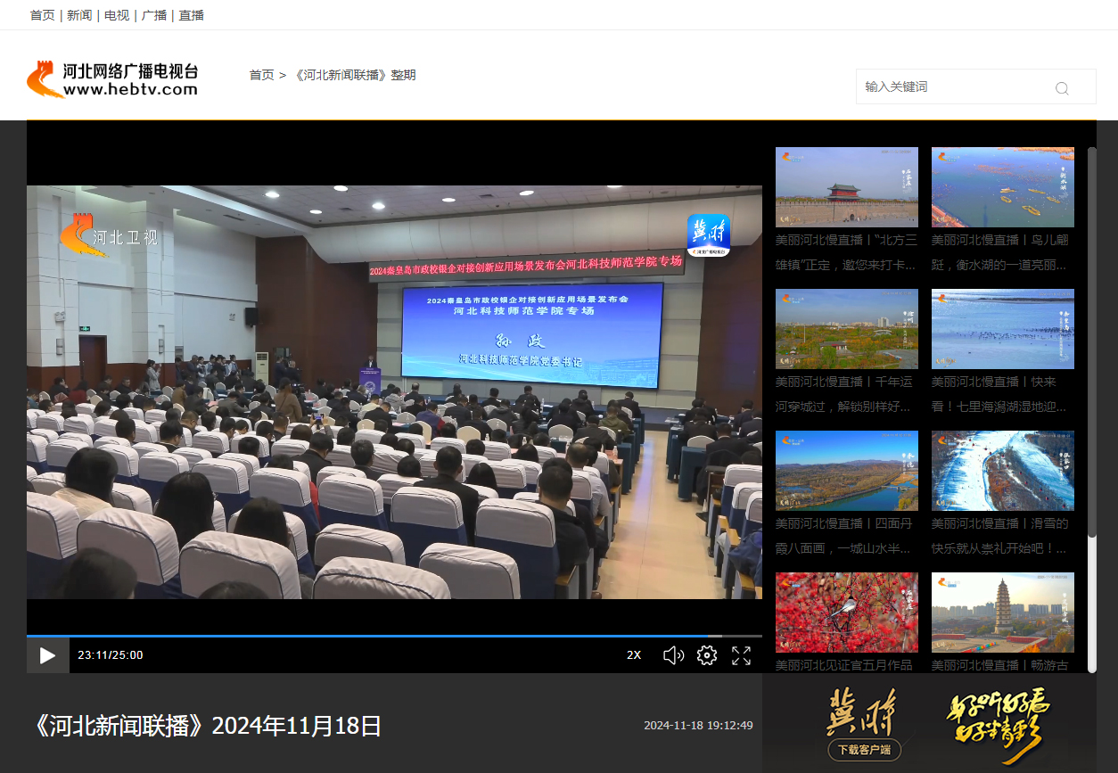 2024年11月18日,《河北新闻联播》河北网络广播电视台对我校承办的2024秦皇岛市政校银企对接创新应用场景发布会河北科技师范学院专场活动进行了宣传报道。