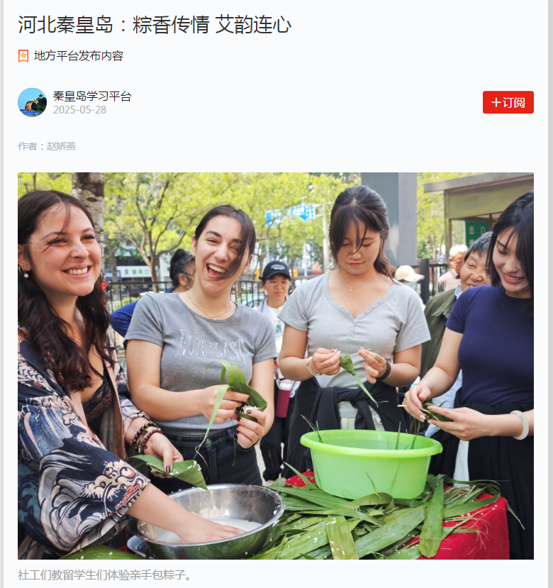 2025年5月28日,学习强国秦皇岛学习平台发“粽香传情 艾韵连心”为题,对我校意大利语交换生在我校传统节日——端午节之际应邀走进河北省秦皇岛市海港区西港路街道和平花园社区,沉浸式体验中国传统文化的魅力活动进行了宣传报道。
